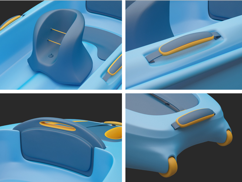 Zaprojektowany kajak przeznaczony jest dla dzieci między 10 a 14 rokiem życia. Model ma wsuwane oparcie i miejsce na odłożenie wiosła. Pokrycie siedziska wykonano z antypoślizgowego materiału. Specjalnie wyprofilowane dno kajaka zapobiega skręcaniu podczas wiosłowania, a umieszczone w nim otwory zapewniają łatwy odpływ wody. Ponadto kajak został wyposażony w boczne uchwyty do przenoszenia, a także niewielkie kółka, które są dużym ułatwieniem podczas transportowa sprzętu. Rączka ze sznura znajdująca się na przodzie kadłuba zapewnia naturalne ułożenie nadgarstka, podczas długotrwałego transportowania(ciągnięcia)obiektu. Koncepcja przewiduje także wbudowaną bojkę przymocowaną sznurkiem do kajaka mogącą służyć do nauki pływania, asekuracji czy zabawy. Stabilizator umieszczony między nogami wioślarza jest jednocześnie pojemnikiem mogącym służyć do przechowywania, podczas rejsu, bidonu z piciem lub innych przedmiotów mieszczących się w tych gabarytach. Kajak daje możliwość sztaplowania, przydatnego w transporcie i magazynowaniu. Sposób, który przewidziałem na układanie kajaków w stosie zapobiega uszkodzeniu ich wnętrza podczas transportu.