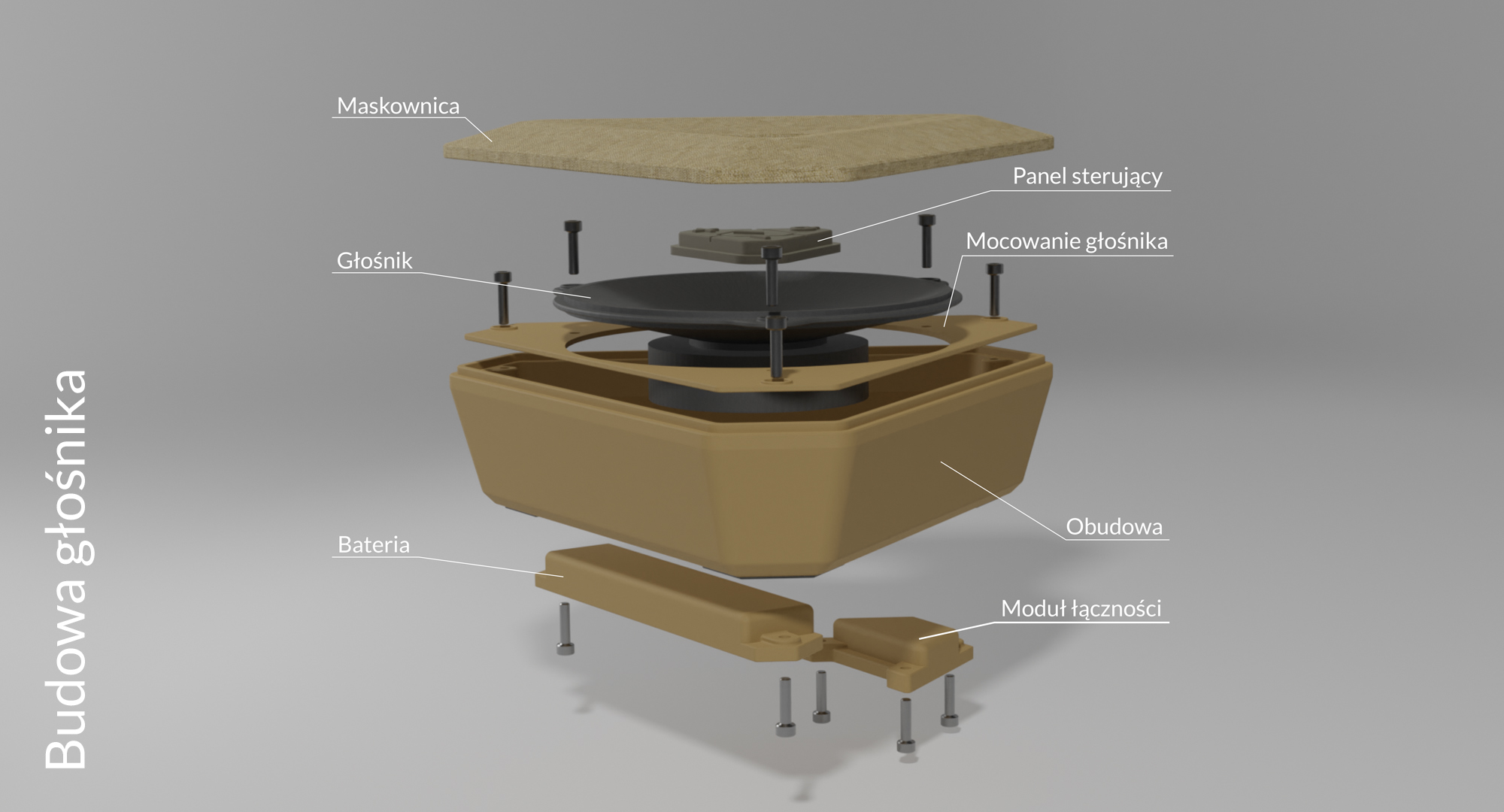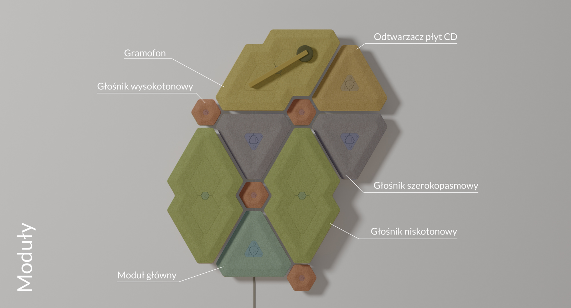 Projekt modułowego systemu audio do wieszania na ścianie. Zawiera moduł główny, sterujący pozostałymi, głośnik wysokotonowy, głośnik szerokopasmowy, głośnik niskotonowy, gramofon, odtwarzacz do płyt CD, oraz system montażowy na ścianie.