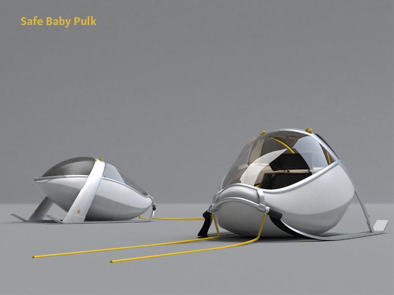 Safe Baby Pulk to projekt skierowany do miłośników zimowego trekkingu, którzy na górskie wyprawy planują zabierać ze sobą dzieci. Projekt umożliwia bezpieczny i komfortowy transport dzieci w wieku od sześciu miesięcy do czterech lat. Obszerna wewnętrzna przestrzeń umożliwia przewożenie dziecka zarówno w pozycji siedzącej, jak i leżącej. Odpowiednio wyprofilowany kształt kadłuba zapewnia doskonałą ochronę i maksymalną stabilność podczas jazdy. Aluminiowa lekka rama będąca elementem konstrukcji poprawia bezpieczeństwo dziecka, nie będąc przy tym obciążeniem dla osoby dorosłej. Projekt przewiduje również użytkowanie Safe Baby Pulk w wersji letniej jako wózka mocowanego do roweru.